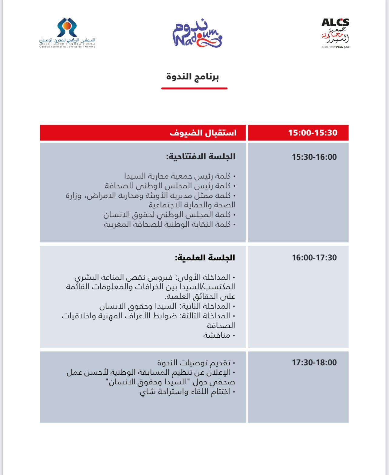 تنظم جمعية محاربة السيدا وشراكائها من الجمعيات الموضوعاتية المشتغلة في إطار المنحة الإقليمية متعددة البلدان شمال إفريقيا والشرق الأوسط وبدعم من الصندوق الدولي لمحاربة السيدا والسل، بشراكة مع المجلس الوطني لحقوق الإنسان، ندوة وطنية حول التغطية الإعلامية لداء فقدان المناعة البشرية المكتسب .